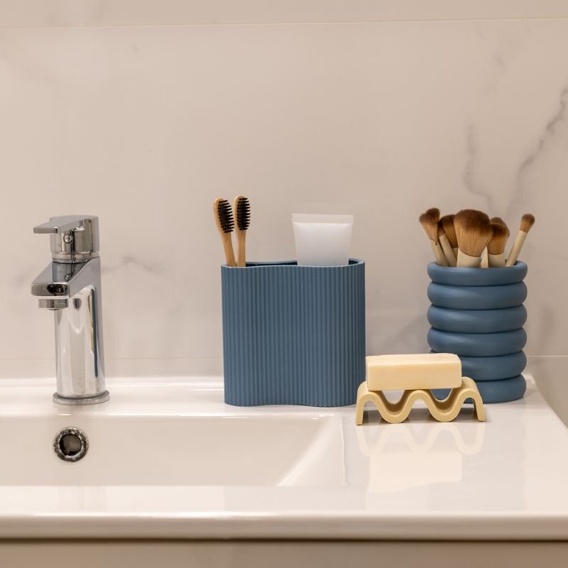 Diseño Elegante: El Porta Cepillos de Dientes Hyalo cuenta con una forma distintiva en S y finas líneas, creando un efecto visual sofisticado y contemporáneo. Este diseño no solo es atractivo, sino que también permite una organización eficiente de tus cepillos de dientes y pasta dental.