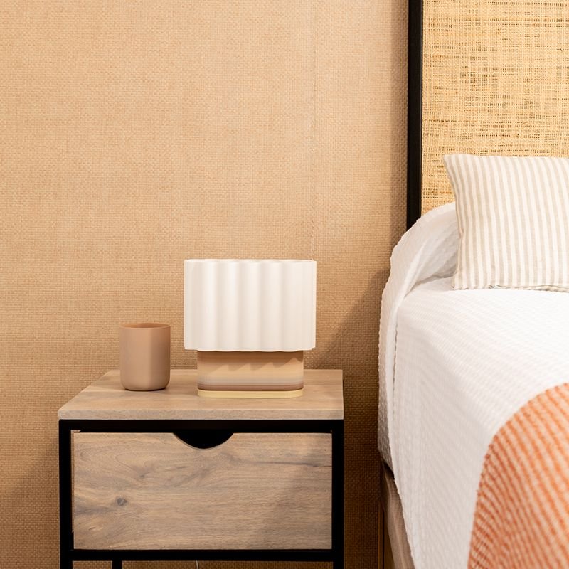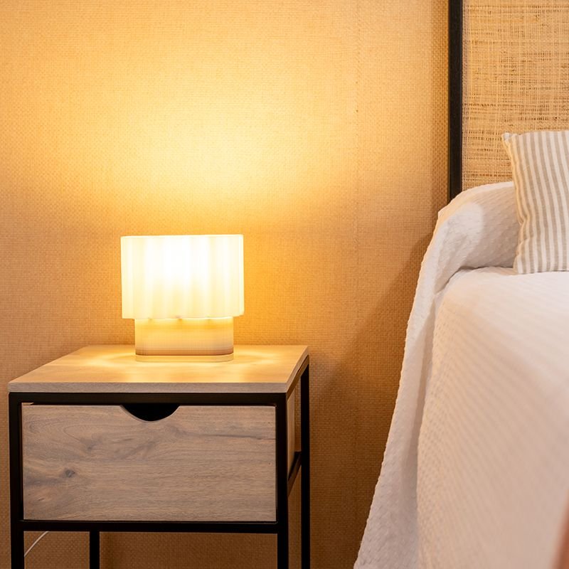 • Pantalla con Ondulaciones: La pantalla con ondulaciones sutiles difunde la luz de manera suave, evocando movimiento y fluidez,  creando un ambiente acogedor y una iluminación cálida y envolvente ideal para mesas de noche, escritorios, o mesas auxiliares.